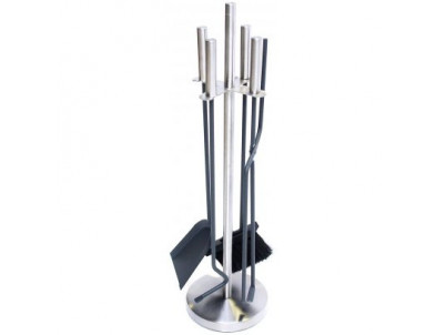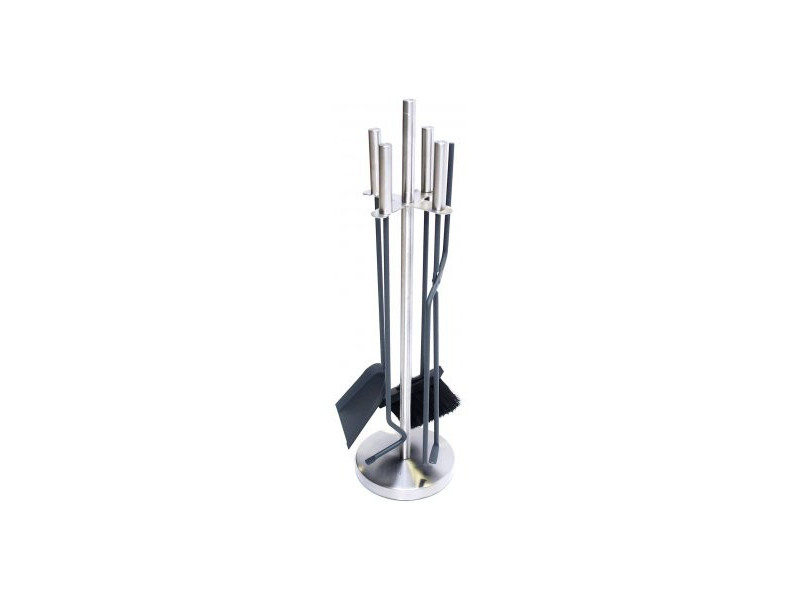Pětidílná sada příslušenství ke krbu z nerezové oceli obsahuje kleště, pohrabáč, smetáček, lopatku, stojan. Rukojeti a stojan nerezavějící ocel, nářadí ocel antracitová, chránič podlahy na stojanu z PVC.