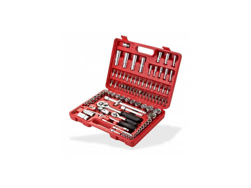 Nástrčkové klíče z chrom-vanadiové oceli s ráčnovou rukojetí z protiskluzového plastu, v pevném plastovém kufříku má každý díl své místo.