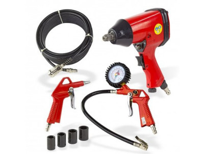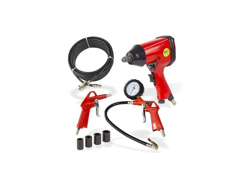 Pneumatický rázový utahovák pro výměnu kol, nástrčné klíče, ofukovací pistole, hadice na stlačený vzduch, huštění pneumatik. Vyrobeno z tlakově litého hliníku, odolný úderový mechanismus, nastavení krouticího momentu pro otáčení vlevo/vpravo.