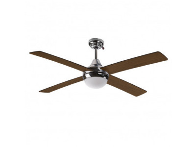 Stropní ventilátor s dálkovým ovladačem, třístupňová rychlost otáčení s dodatečně nastavitelnou funkcí časovače, extra zapínatelné osvětlení a letní/zimní nastavení přepínatelné na přístroji. Chromované kovové tělo, hnědé lopatky z MDF ve vzhledu dřeva, satinovaný skleněný kryt lampy.
