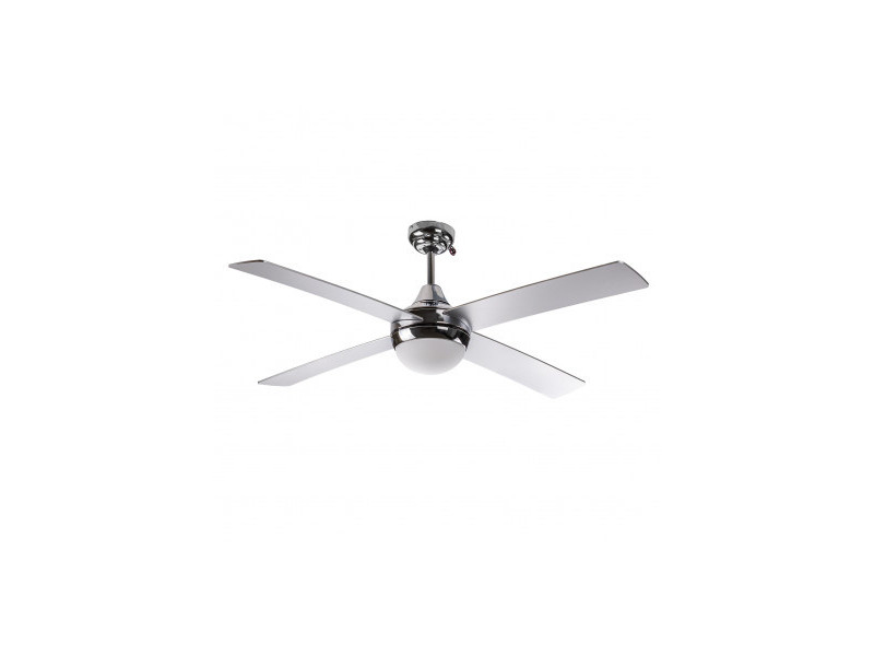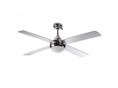 Stropní ventilátor s dálkovým ovladačem, třístupňová rychlost otáčení s dodatečně nastavitelnou funkcí časovače, extra zapínatelné osvětlení a letní/zimní nastavení přepínatelné na přístroji. Chromované kovové tělo, stříbrné lopatky z MDF, satinovaný skleněný kryt lampy.