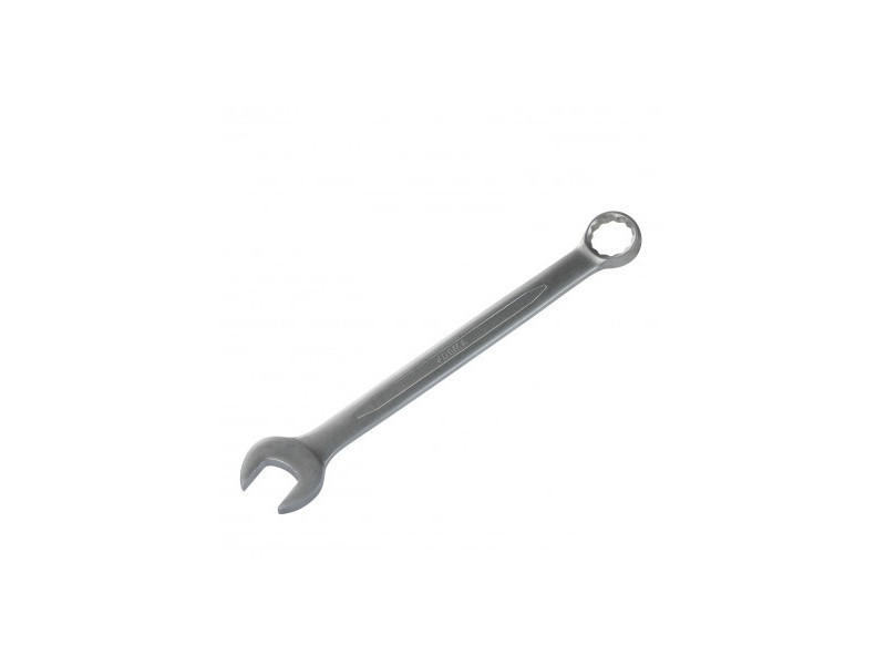 Prstencovo-vidlicový klíč z chrom-vanadiové oceli, ohnutý o 15° a vybavený dvanáctihranným upnutím, čímž umožňuje práci i na těžko dostupných místech. Matný, pochromovaný povrch.