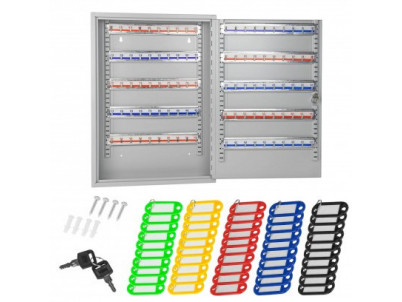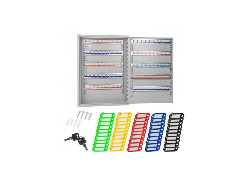 Kovová skříňka na klíče s výškově nastavitelnými háčky. Barevné kroužky na klíče v 5 barvách (celkem 50 ks) pro lepší rozpoznání klíčů. Válcový zámek skříňky se dvěma klíči a možností upevnění na zeď (šrouby jsou součástí dodávky).